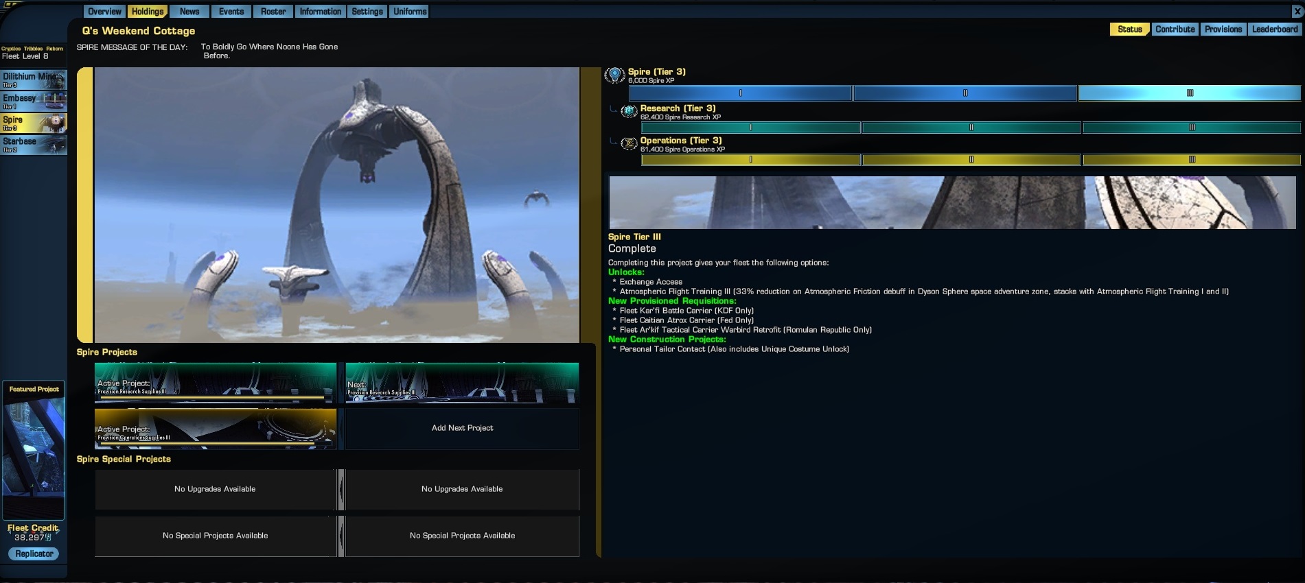 You can Transwarp directly to the Spire for anywhere via your Transwarp button, from the Starbase, Embassy and Mine. When you first arrive, it is like the mine. You arrive outside the Spire and contact Traffic Control to Dock with the Spire. Here is what you will see.