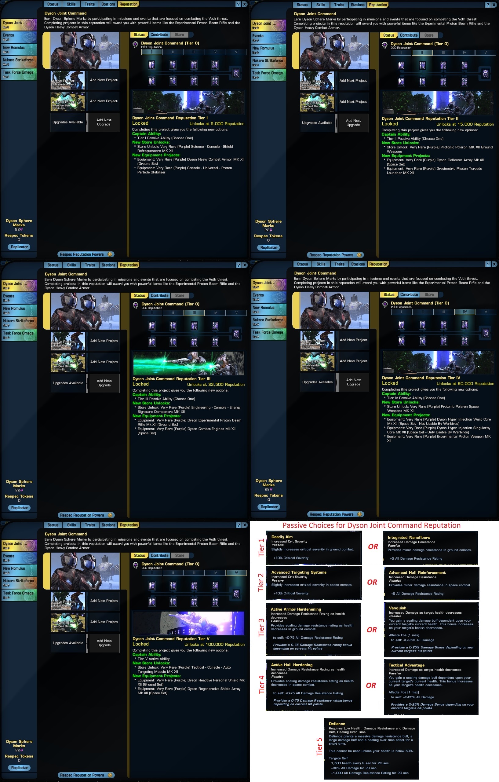Here is the Dyson Joint Command Reputation System. Here is the big change....The Large Reputation Project still has it's 20 Hr Cooldown, but only takes 1 Dyson Commendation Point, which you get once a day, for completing the first Dyson PVE of the day. The Small Reputation Project has only a 1 hr cooldown, and can be repeated numerous times. Takes Dyson Sphere Marks, Expertise & Energy Credits to fill. Gone are the commodities. The biggest thing to point out is that as soon as the timer starts (filled the project and it starts counting down), you get a reward then, plus Dilithium when it finishes. Will work on getting more screenshots of consoles, weapons and such as I come across them.