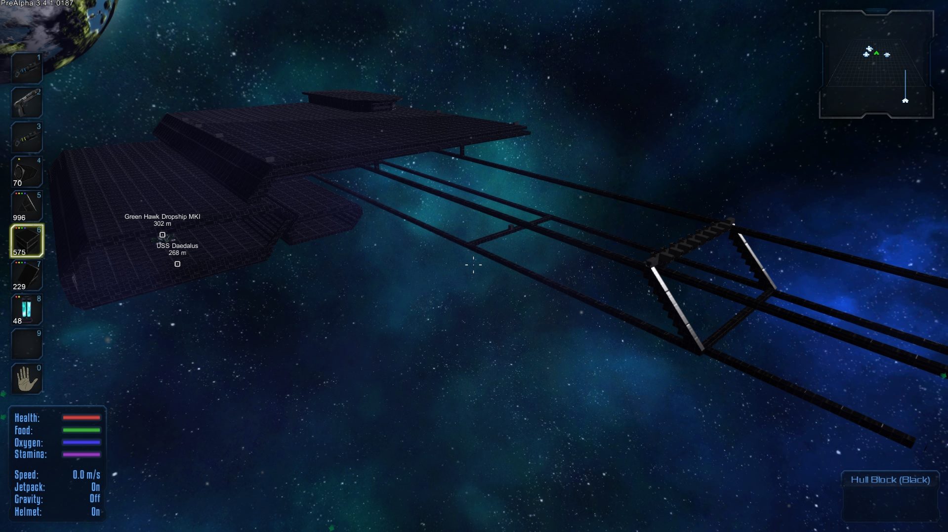3rd person view of character next to dropship... 3rd person zoomed out to show all of the Daedalus constructed so far...